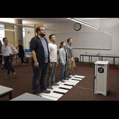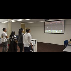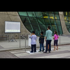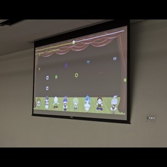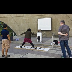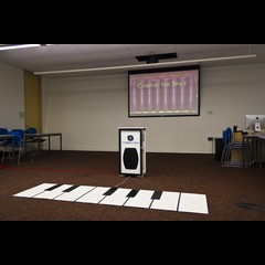 A ddr style rhythm game was created for the installation for the participants to play as a way to get them to initially interact (the piano could also be played as a standalone piano). An artist, Louisa Lin helped is with the graphics and we featured a few local artist's music for the game. Since the running hardware was limited, one challenge was getting the game's timing to run smoothly to be able to match the beats to music as that was key to being able to play the game. It was written in java, using the processing framework.